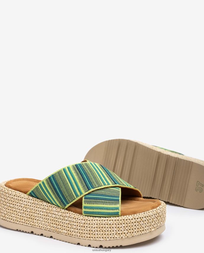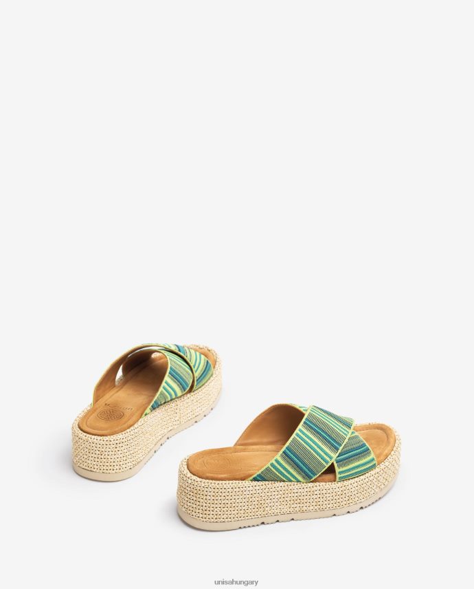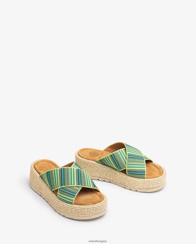 kerek orrú szandál többszínű keresztpánttal. 4,5 cm magas tömbsarok és 3 cm-es platform, természetes színű rafiával bevonva. vastag hab az egész talpban a nagyobb kényelem érdekében. a kényelem teljes pompájába került.