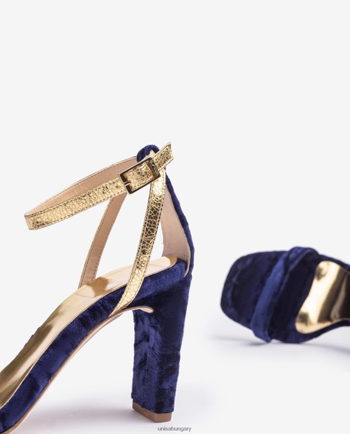 bársonyból készült négyzettalpú szandál. vékony aranyszínű bokapántok, melyek a fém csattal állíthatók. 8,5 cm magas, bársonnyal bevont sarok. bőr talp. a cherubina új unisa kollekciója tökéletességével fog magával ragadni. A