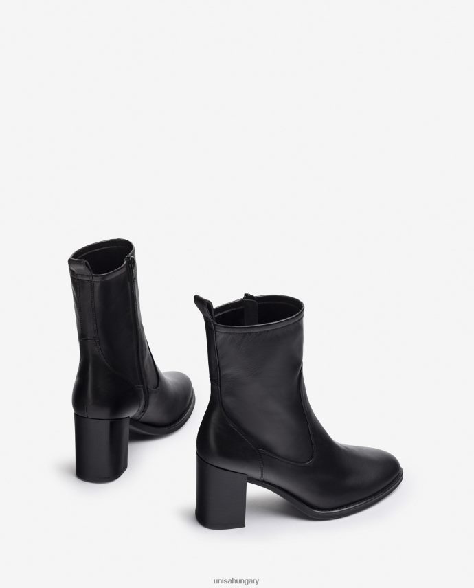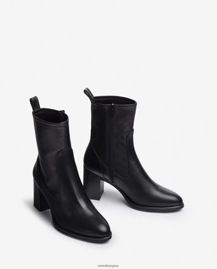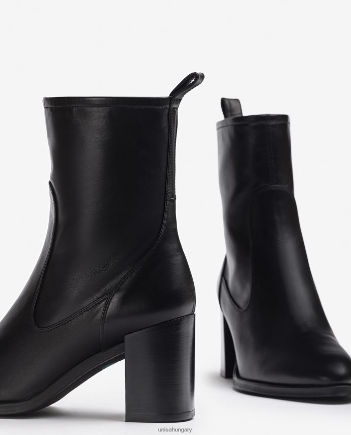 Bőrből készült bokacsizma belül cipzárral. hozzáillő színű fa hatású sarok 7,5 cm magas. könnyű, rugalmas, csúszásmentes gumitalp. tökéletes szövetségesei az unisa nőnek.