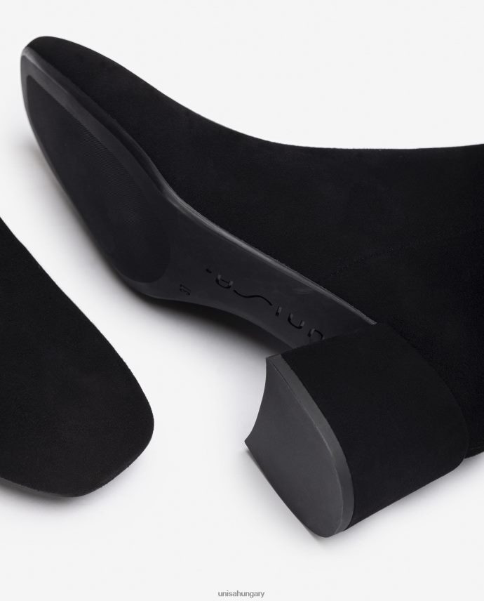 négyzet orrú csizma velúrból. cipzár a belsejében és széles sarok 6 cm magas, hozzáillő színben. könnyű, rugalmas, csúszásmentes gumitalp. nélkülözhetetlen klasszikus az unisa világban.