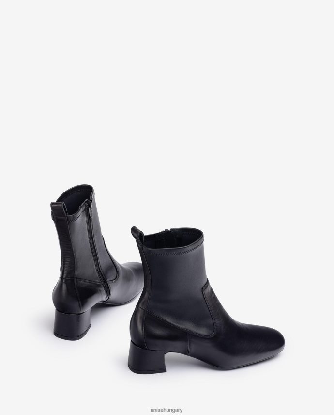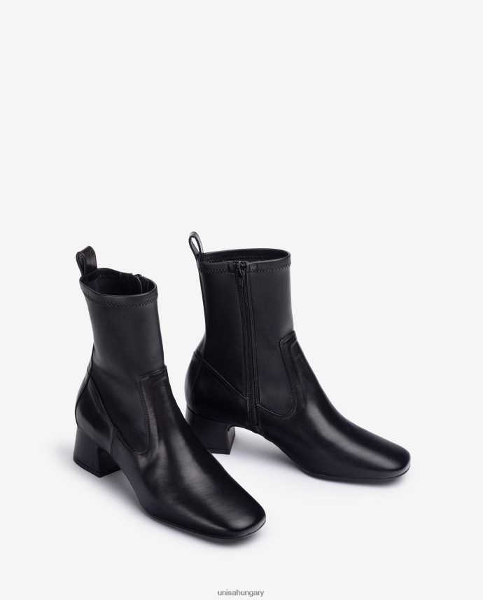 Négyzet orrú bokacsizma bőrből és bőrhatású sztreccs anyagból. hozzáillő színű 4,5 cm-es sarok és gumi csúszásmentes, könnyű és rugalmas talp. nélkülözhetetlen klasszikus az unisa világban.