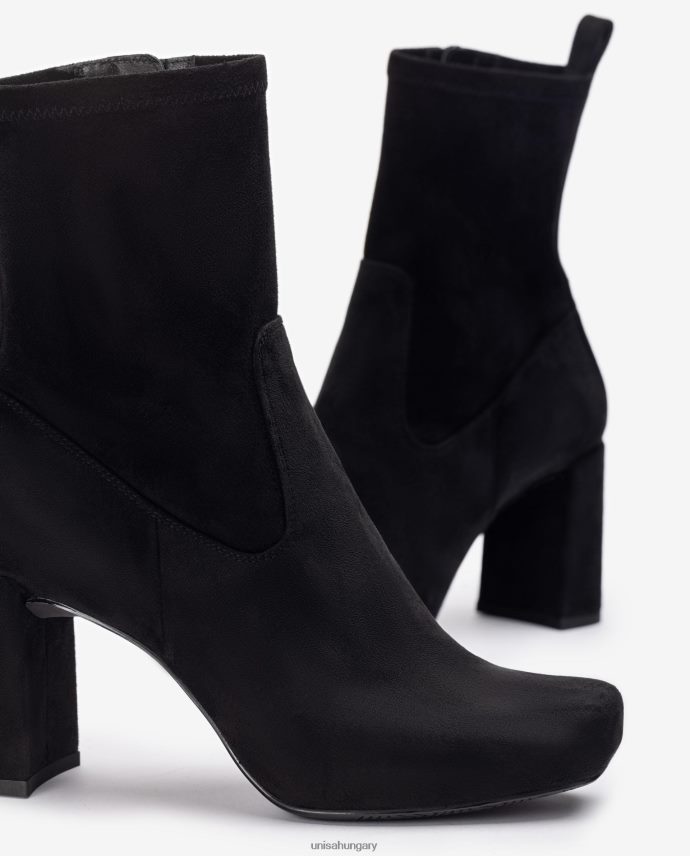 négyzet orrú bokacsizma velúr hatású sztreccs anyagból. 8 cm-es sarok és 1,7 cm-es belső platform. könnyű, rugalmas, csúszásmentes gumitalp. varrásszegély az elején. nélkülözhetetlen klasszikus az unisa világban.