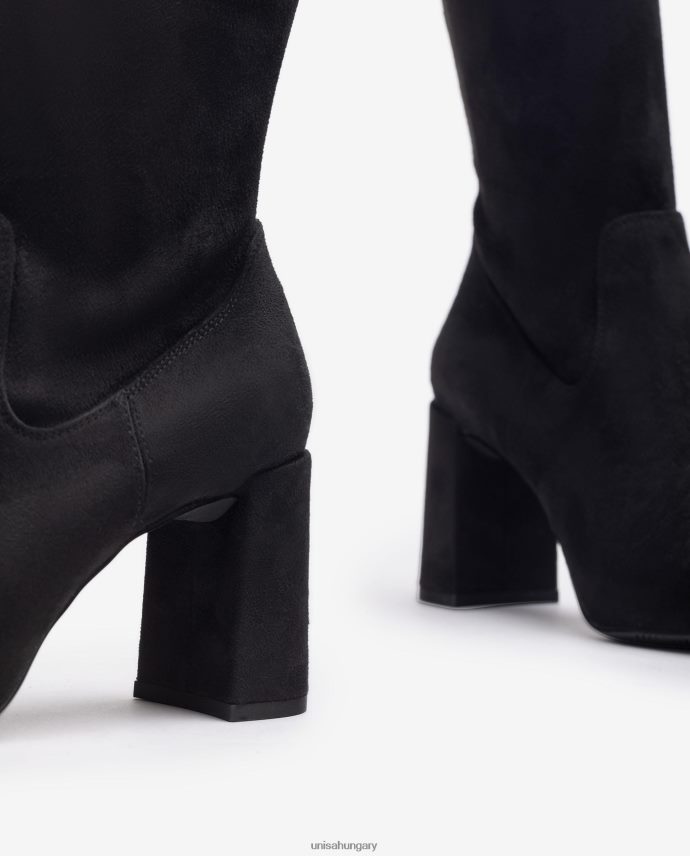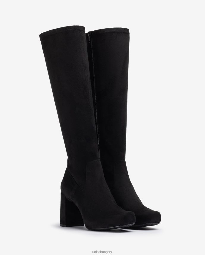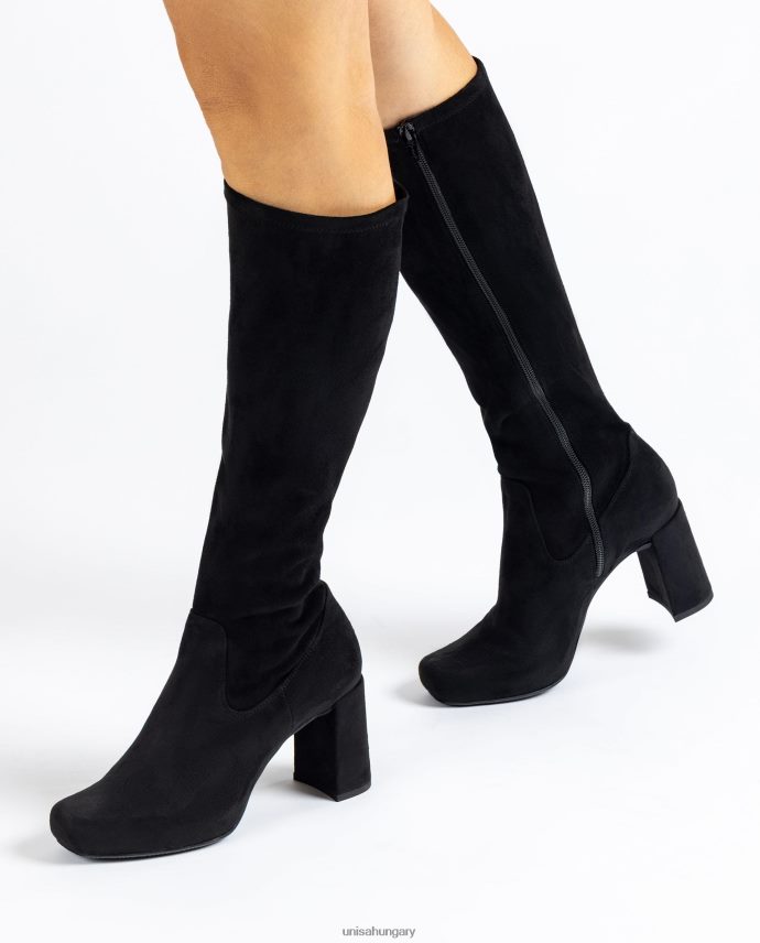 négyzet orrú csizma velúr hatású sztreccs anyagból. 8 cm-es sarok és 1,7 cm-es belső platform. könnyű, rugalmas, csúszásmentes gumitalp. varrásszegély az elején. nélkülözhetetlen klasszikus az unisa világban.