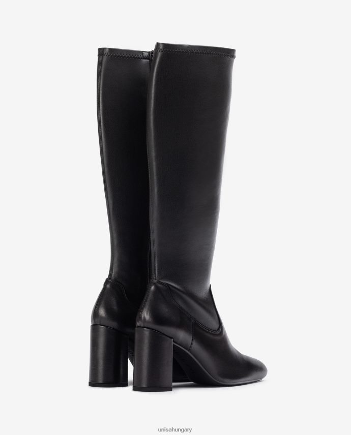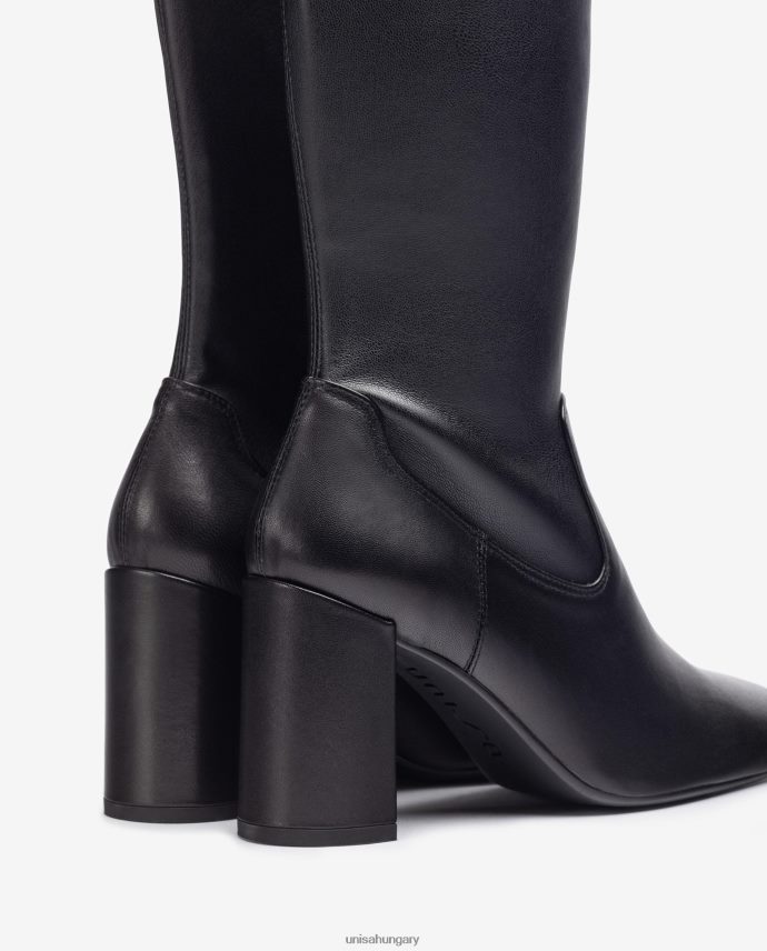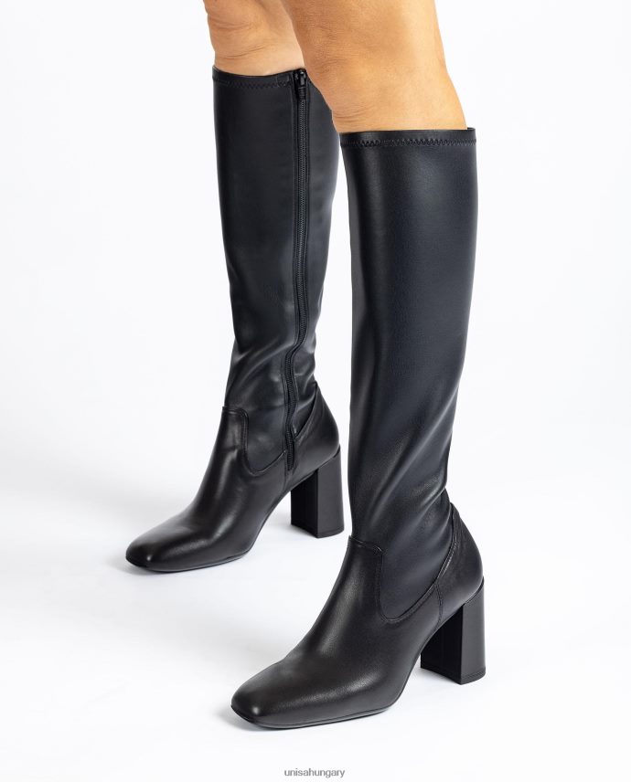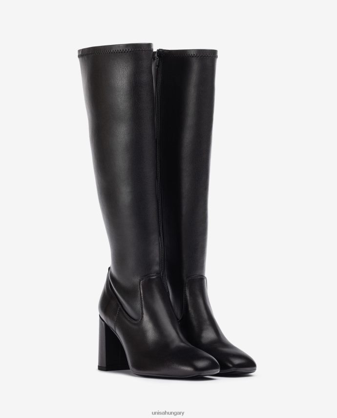 négyzetes orrú bőrcsizma negyed felső vonallal, bőrhatású sztreccsbőrből. cipzár a belsejében és egy 8,5 cm magas sarok. könnyű, rugalmas, csúszásmentes gumitalp. tökéletes szövetségesei az unisa nőnek.