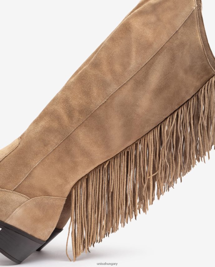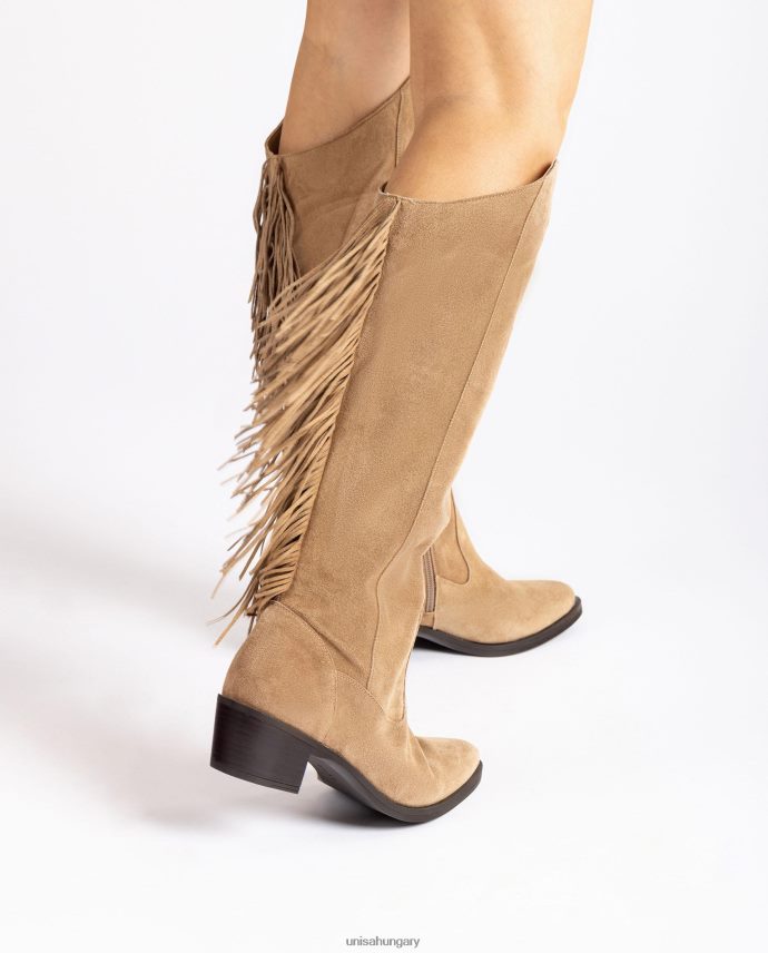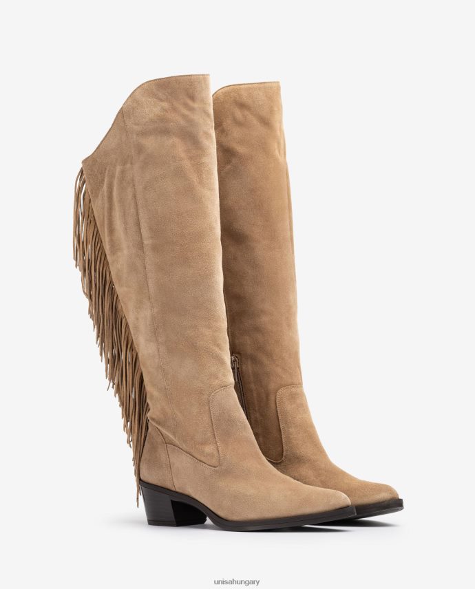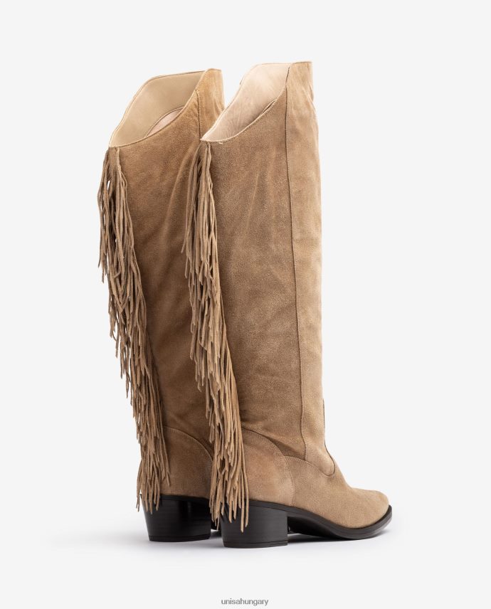 velúr cowboy stílusú csizma bojtokkal a csizmaszár hátsó részén. 5 cm magas sarok és könnyű, rugalmas és csúszásmentes talp. egy trend, amely rést talált az új unisa kollekcióban.