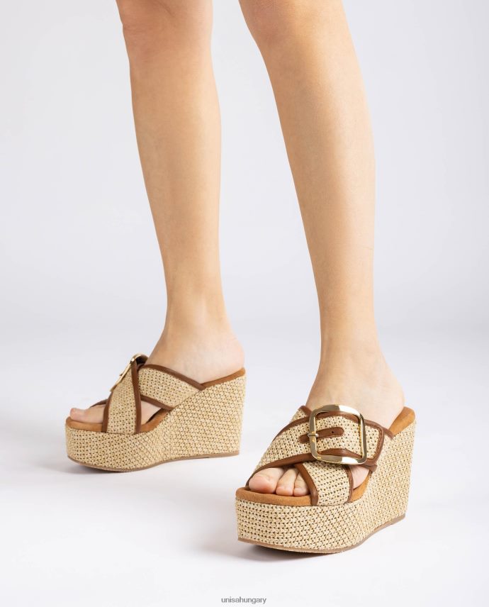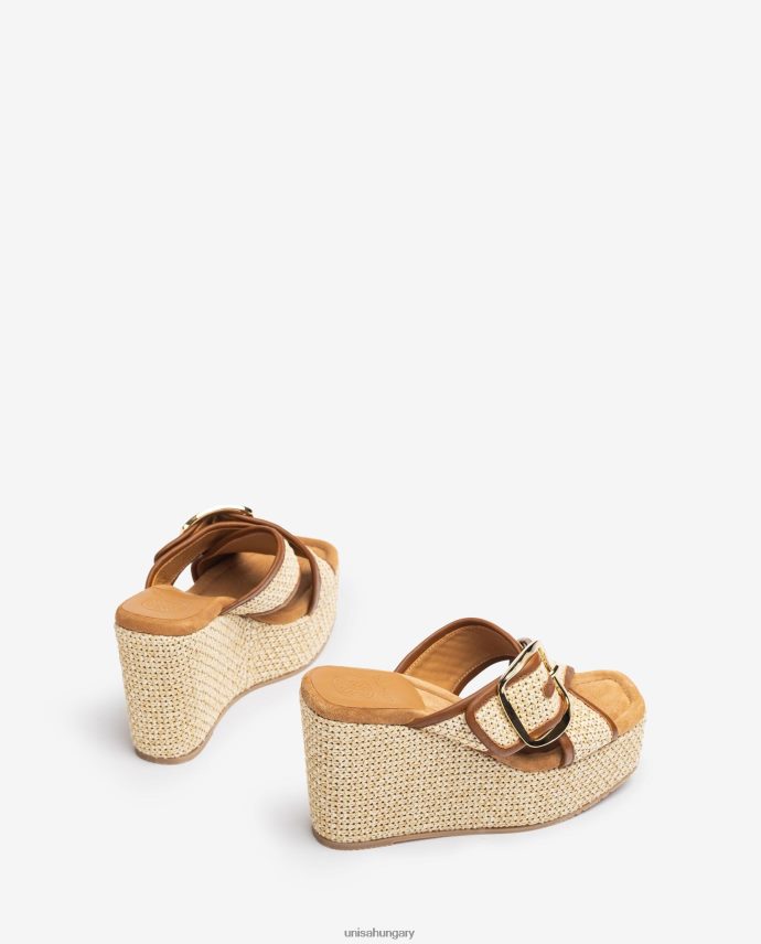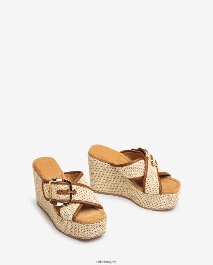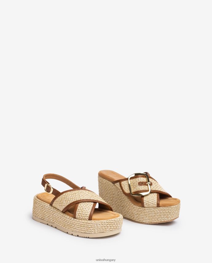 natúr raffiából készült négyszögletes orrú szandál. széles crossover pántok a lábfejen és egy nagy fém csat. 10 cm magas ék és 4 cm-es, természetes rafiával borított platform. könnyű, csúszásmentes, gumi talp. innovatív kialakítású szandálok minden rendezvényére.