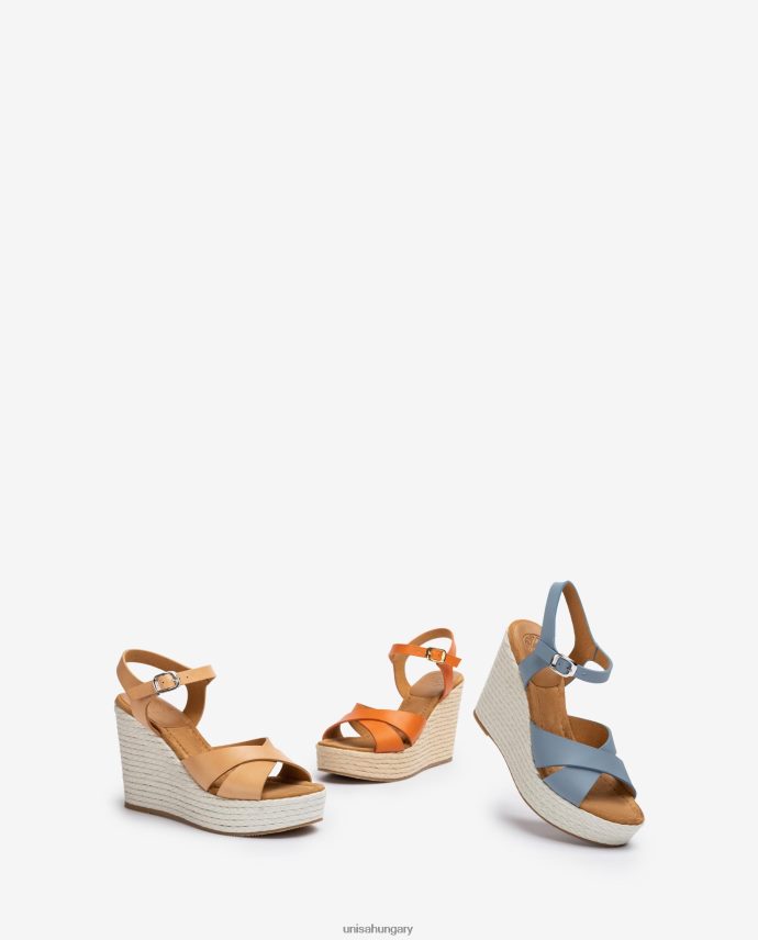 Bőrből készült, négyszögletes orrú szandál. keresztpántok az elején és egy bokapánt, amely a fém csattal állítható. 10,5 cm-es tömbsarok és 3,5 cm-es platform természetes színű pamutfonattal borítva. könnyű, csúszásmentes, gumi talp. új ékkollekciónk meglep.
