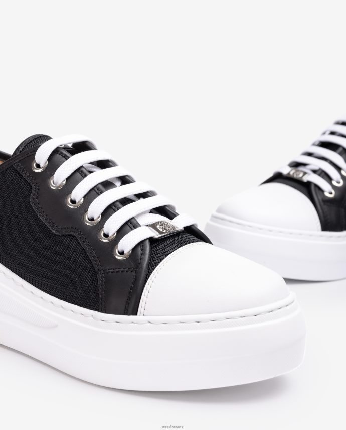 kontrasztos anyagból és fémes bőrből készült cipők. fehér bőr lábujj. szuperlágy technológiával készült kivehető talpbetét a nagyobb kényelem érdekében. 4 cm-es platformtalp térfogattal. a strobel varrásrendszert a nagyobb rugalmasság és könnyedség érdekében használták.